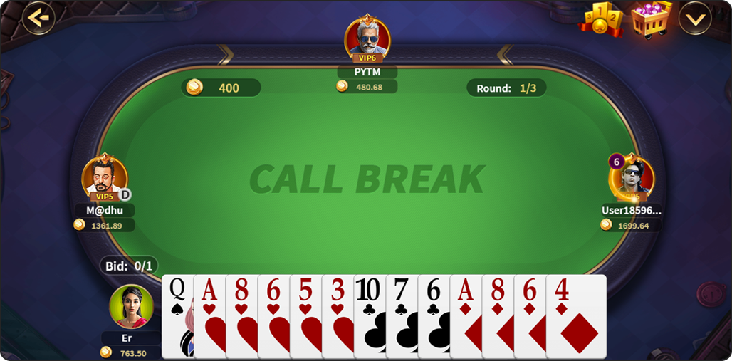 2. Standard single deck without the joker. Ranking of the cards in the same suit:A>K>Q>J>10>9>8>7>6>5>4>3>23. Spades are always the trump cards.