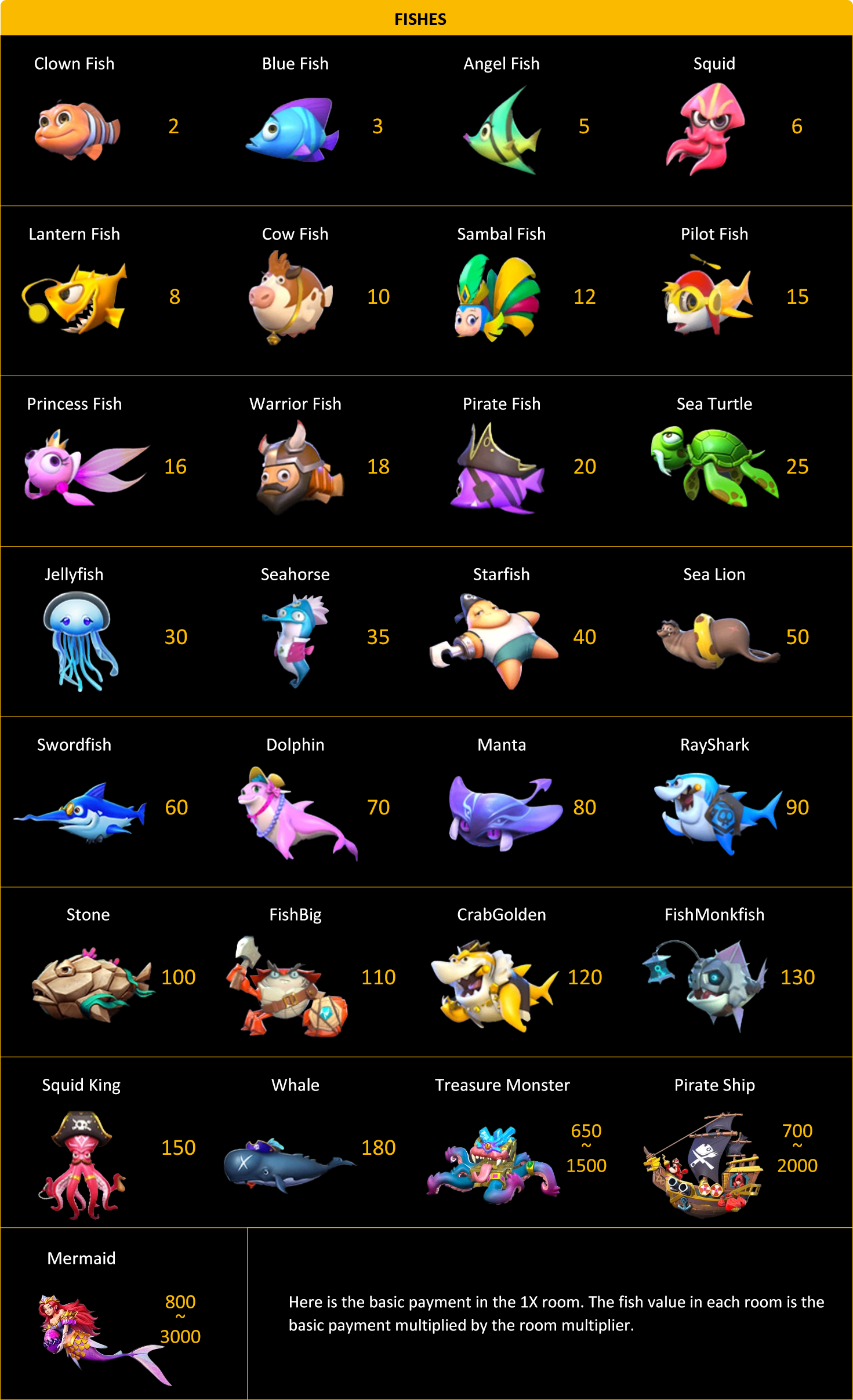 • After the fish is killed, the player receives payment equal to the value of the fish inthis room, that is, the basic payment * room multiplier.