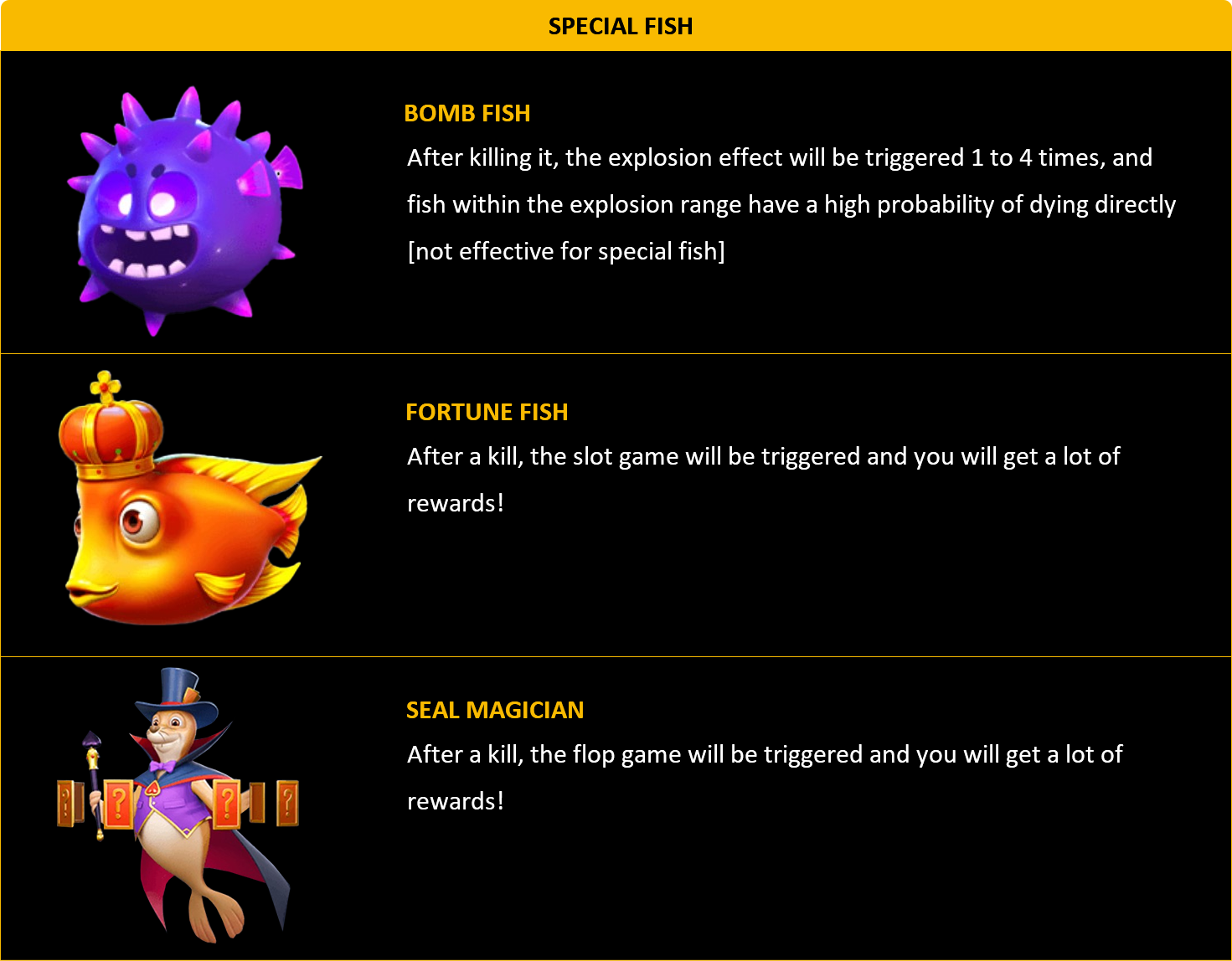 • If multiple players shoot at the same fish at the same time, the player who kills the fish will receive the entire payment for the fish.
